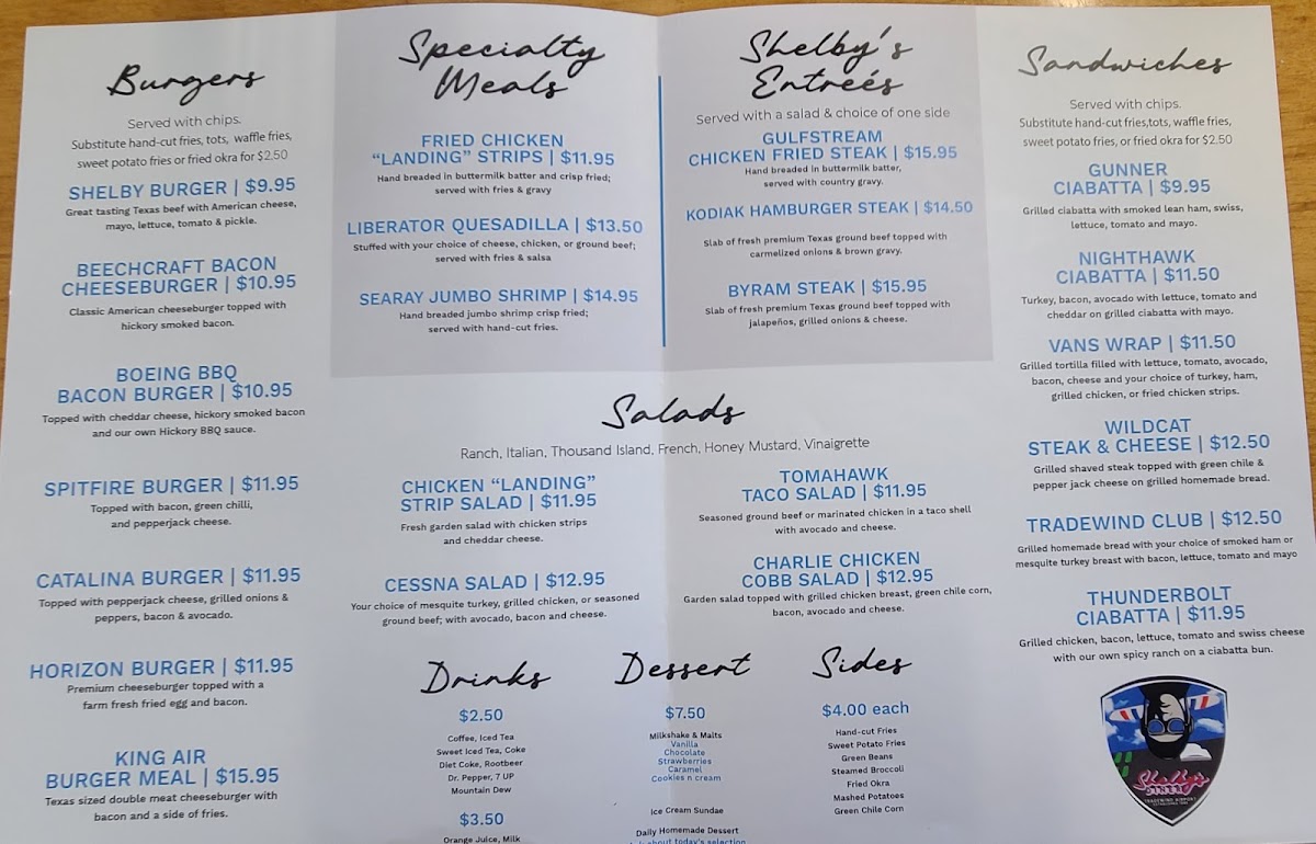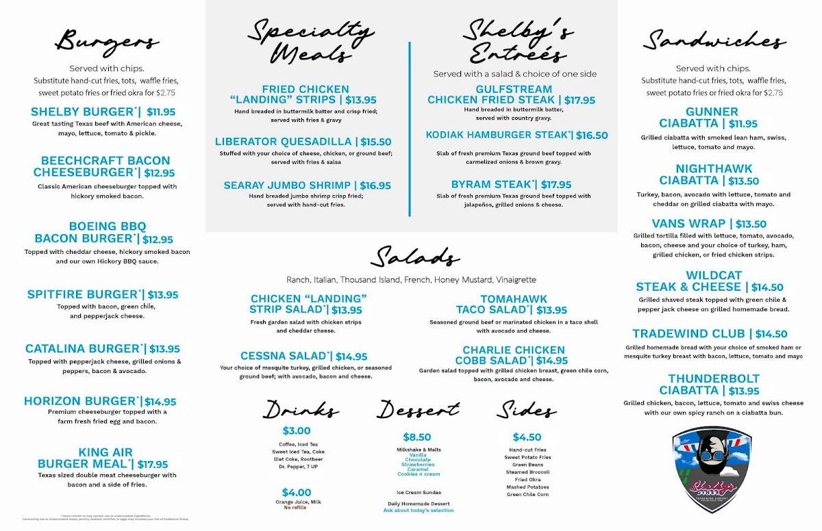 From a reviewer’s perspective, the menu at Shelby’S Amarillo, located at 4105 Tradewind St, Amarillo, TX 79118, United States, feels like a confident wrap-up of classic American comfort food with a playful aviation-inspired twist. The selection is broad without feeling unfocused, making it easy to find something satisfying no matter your mood. Lighter options such as the Tomahawk Taco Salad and Charlie Chicken Cobb Salad offer freshness and balance, while heartier choices dominate the menu with bold flavors and generous portions. Burger lovers are especially well cared for, with standouts like the Shelby Burger, Beechcraft Bacon Cheeseburger, Boeing BBQ Bacon Burger, Spitfire Burger, and Catalina Burger, each delivering its own take on a timeless favorite.