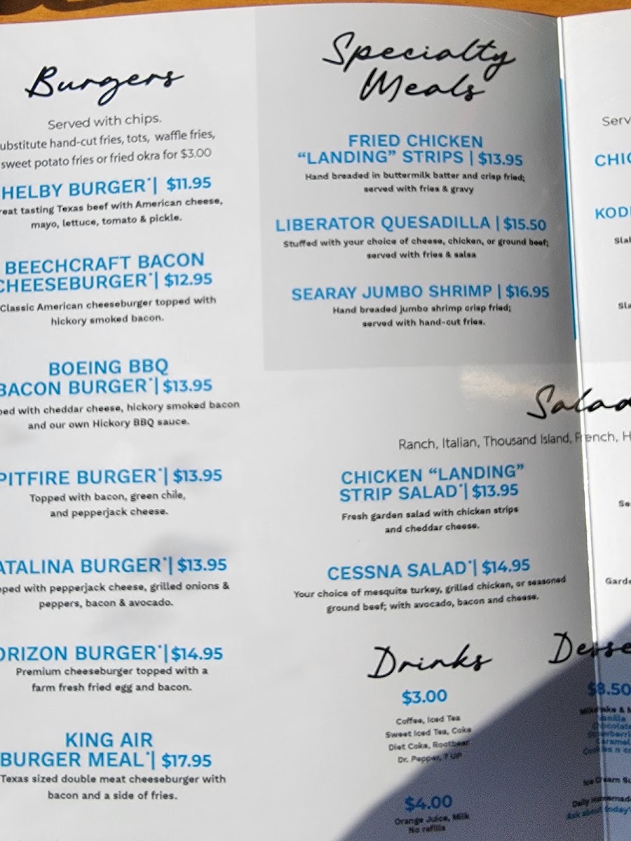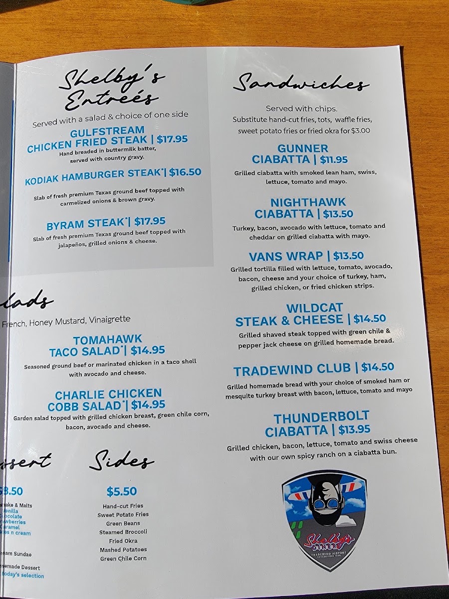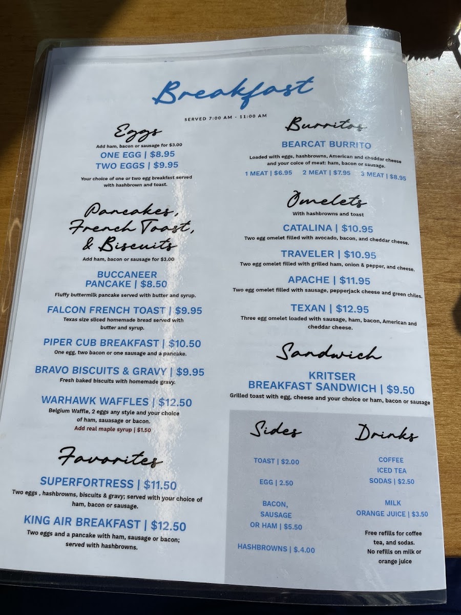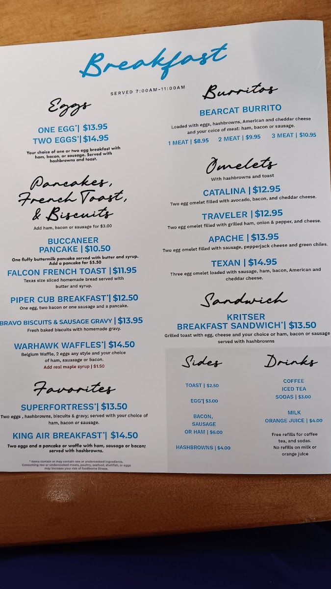 The sandwich lineup, including the Gunner Ciabatta, Nighthawk Ciabatta, Vans Wrap, Wildcat Steak & Cheese, and Tradewind Club, adds variety and makes the menu feel complete for lunch or dinner crowds. For those craving something more substantial, specialty and comfort-driven plates such as Fried Chicken “Landing” Strips, Liberator Quesadilla, Searay Jumbo Shrimp, Gulfstream Chicken Fried Steak, Kodiak Hamburger Steak, and Byram Steak reinforce the restaurant’s strength in classic, filling meals. The Superfortress and King Air Breakfast further highlight the “favorites” that regulars are likely to return for, while the Bearcat Burrito brings a satisfying, all-in-one option to the table.