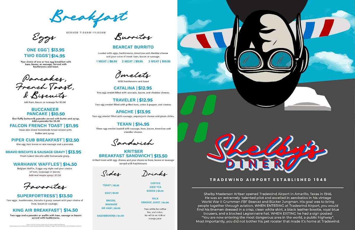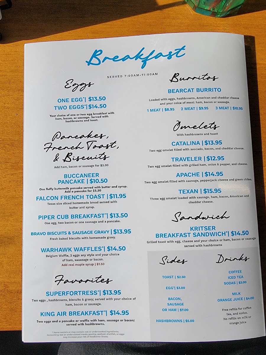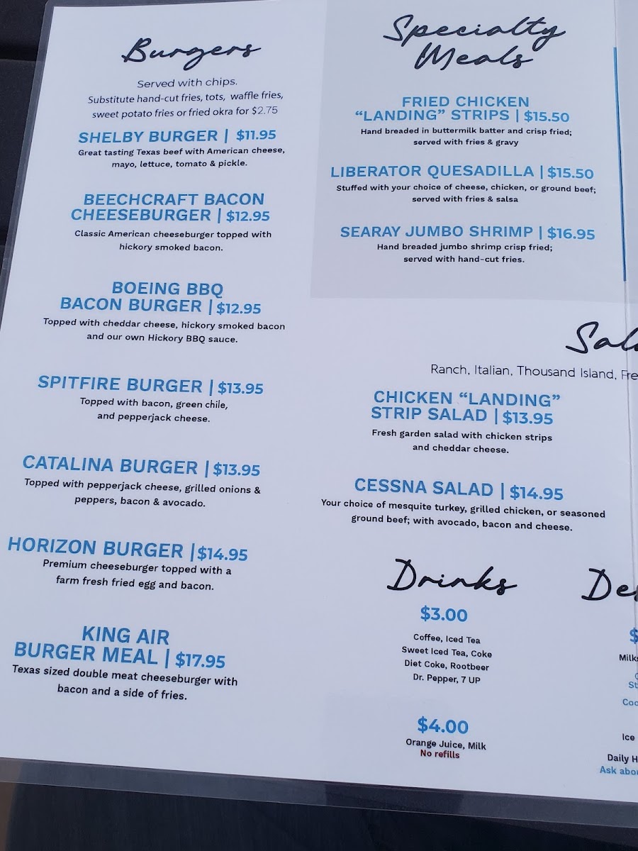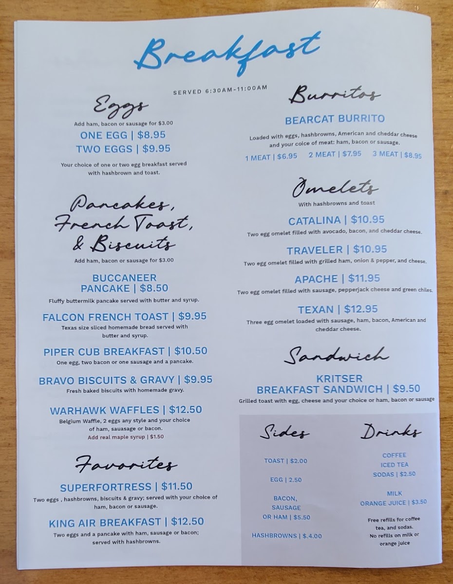 The sandwich lineup, including the Gunner Ciabatta, Nighthawk Ciabatta, Vans Wrap, Wildcat Steak & Cheese, and Tradewind Club, adds variety and makes the menu feel complete for lunch or dinner crowds. For those craving something more substantial, specialty and comfort-driven plates such as Fried Chicken “Landing” Strips, Liberator Quesadilla, Searay Jumbo Shrimp, Gulfstream Chicken Fried Steak, Kodiak Hamburger Steak, and Byram Steak reinforce the restaurant’s strength in classic, filling meals. The Superfortress and King Air Breakfast further highlight the “favorites” that regulars are likely to return for, while the Bearcat Burrito brings a satisfying, all-in-one option to the table.